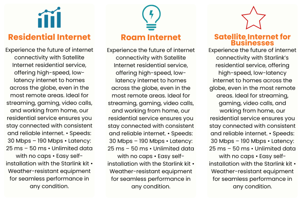 Compared to other satellite internet providers, Starlinked Tech offers unlimited high speed internet with no contract required.Experience seamless connectivity even in the most remote areas—stay online wherever you are.